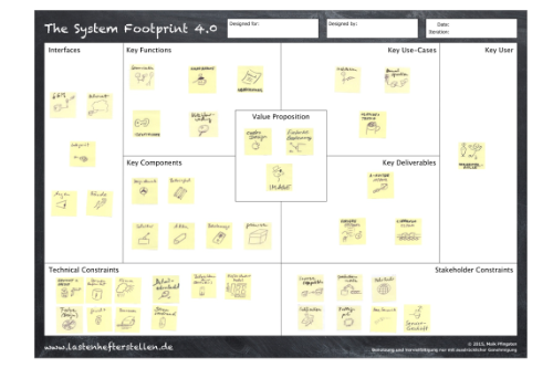 Durch die sehr übersichtliche Canvas-Struktur des System-Footrprints wissen alle Teilnehmenden welche Aspekte betrachtet werden. Zwischen den Feldern des System-Footprint kann schnell gesprungen werden – so wie die Gedanken im Kopf jedes Menschen.